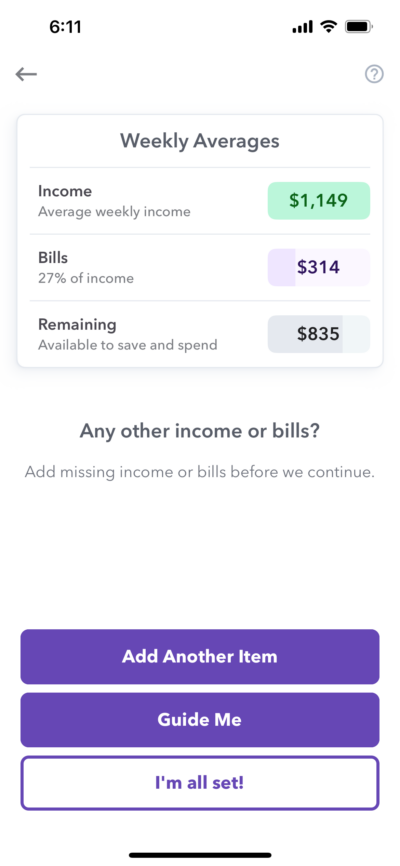 94% of users say Weekly has improved their finances. As you use the app, if your habits change, you can adjust your budget then. If a bill amount changes or is no longer necessary, you can always delete it later on.